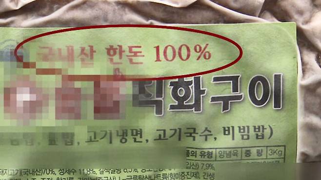 온라인을 통해 전국에 판매된 가공식품 재료로 쓰였는데, 국내산 돼지고기를 뜻하는 '한돈'이라는 문구가 쓰여있습니다.