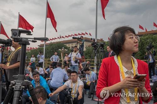 epa09314645 Media workers attend a celebration marking the 100th founding anniversary of the Chinese Communist Party on Tiananmen Square in Beijing, China, 01 July 2021. China celebrates on 01 July the 100th anniversary of the founding of the ruling Chinese Communist Party. EPA/ROMAN PILIPEY