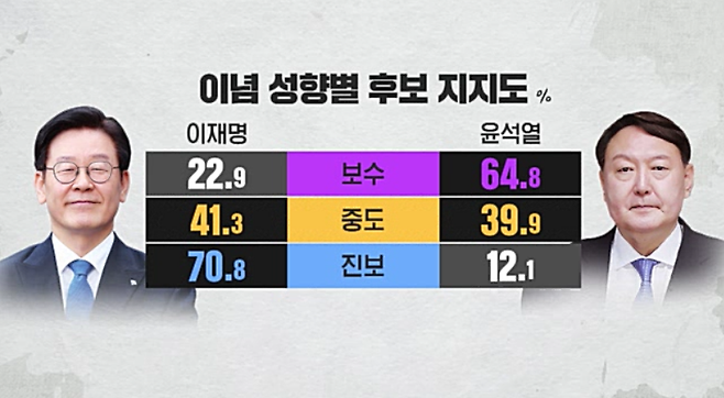 이념 성향별로는 보수층에서는 윤 전 총장, 진보층에서는 이 지사 지지가 압도적인데 중도층의 경우에는 팽팽했습니다.