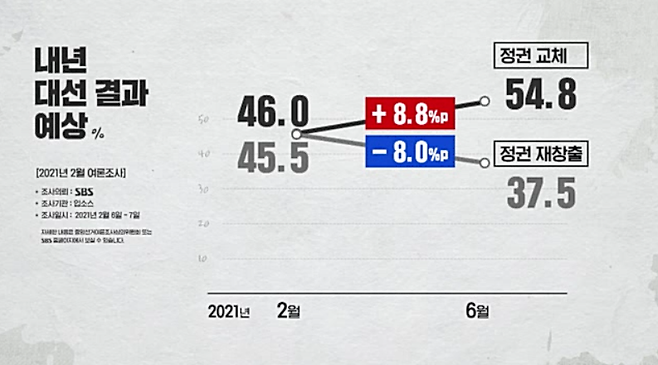 지난 2월 조사와 비교해보면 '정권 교체'는 8.8%포인트 늘고 '정권 재창출'은 8%포인트 줄었는데, 올해 3월 LH 사태 등이 터지면서 부동산 민심이 나빠진 점 등이 영향을 미친 것으로 보입니다.