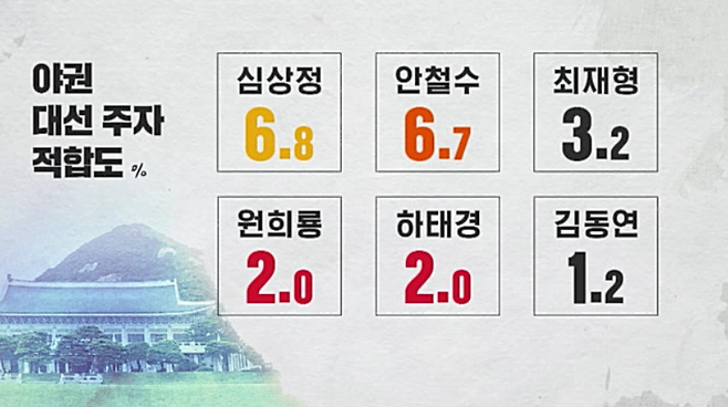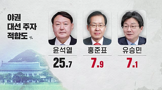 야권에서는 윤석열 전 검찰총장 25.7%, 홍준표 의원 7.9%, 유승민 전 의원 7.1%였고, 심상정 의원 6.8%, 안철수 국민의당 대표 6.7%, 최재형 전 감사원장 3.2%, 원희룡 제주지사 2%, 하태경 의원 2%, 김동연 전 경제부총리 1.2%로 나타났습니다.