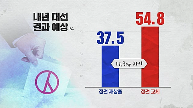 정권 재창출 37.5%, 정권 교체 54.8%로 '정권 교체' 응답이 17.3%포인트 높았습니다.