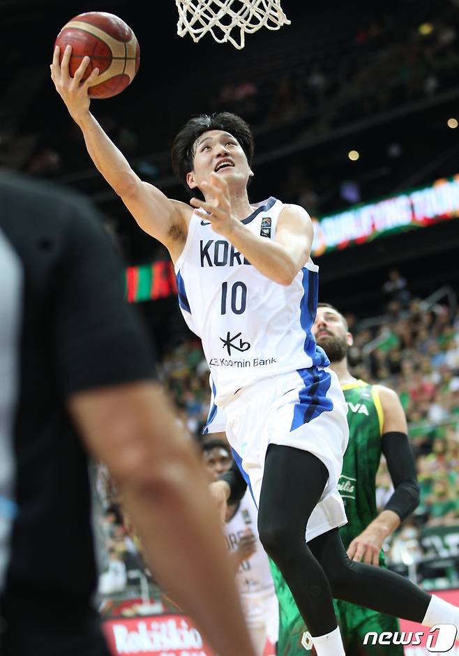 (서울=뉴스1) = 2일 리투아니아 카우나스에 열린 2020 도쿄 올림픽 남자농구 최종예선 A조 조별리그 최종 2차전 대한민국과 리투아니아의 경기에서 문성곤이 슛을 하고 있다. 이날 남자농구 대표팀은 57-96으로 완패해 도쿄 올림픽 진출이 좌절됐다.(대한민국농구협회 제공) 2021.7.2/뉴스1