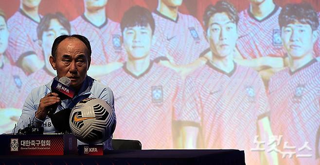 김학범 대한민국 올림픽 축구대표팀 감독이 30일 오후 서울 종로구 광화문 KT스퀘어 드림홀에서 열린 ‘2020 도쿄올림픽 최종 명단 발표 기자회견’에서 답변을 하고 있다. 김 감독은 와일드카드 3명으로 황의조와 권창훈, 김민재를 포함한 18명 최종 명단을 발표했다. 이한형 기자
