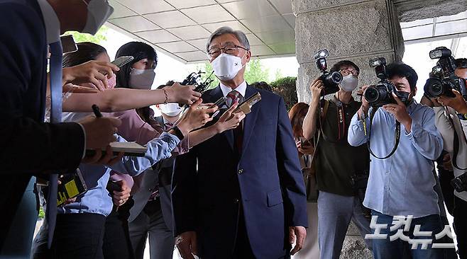 야권의 잠재적 대권주자로 거론되는 최재형 감사원장이 28일 오전 서울 종로구 감사원으로 출근하며 사의를 표명한 뒤 취재진의 질문을 듣고 있다. 최 감사원장은 "감사원장직 수행하는 것이 적절치 않다고 생각해 대통령님께 사의 표명했다"고 밝혔다. 박종민 기자