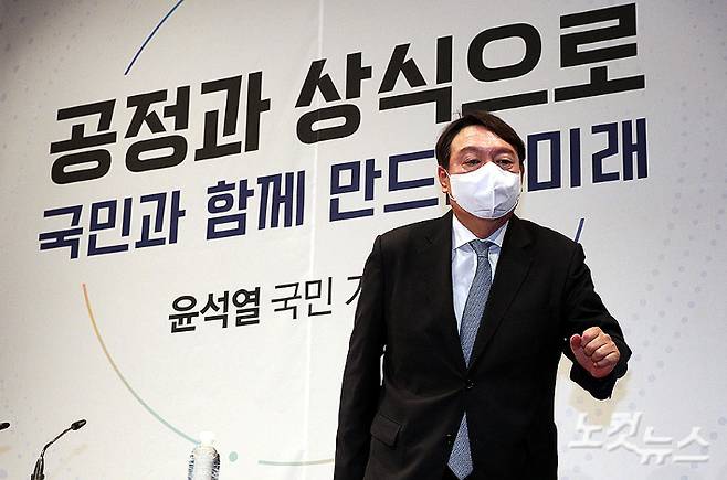 윤석열 전 검찰총장이 29일 오후 서울 서초구 매헌 윤봉길 의사 기념관에서 대선출마 선언과 기자회견을 마친 뒤 단상에서 내려오고 있다. 윤 전 총장은 "부패하고 무능한 정권의 국민 약탈을 막고 정권을 교체하자"며 사실상 대선 도전을 공식화했다. 황진환 기자