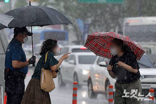 돌풍과 천둥·번개를 동반한 소나기가 내린 30일 서울 광화문광장에서 경찰의 우산 밑에서 비를 피하던 시민이 행인에게 동행을 요청하고 있다. 박종민 기자