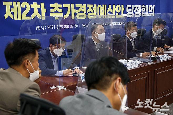 홍남기 경제부총리 겸 기획재정부 장관(왼쪽두번째)이 29일 국회 의원회관에서 열린 2021 제2차 추가경정예산안 당정협의에 참석해 발언하고 있다. 정부는 1일 국무회의에서 의결한 '2021년 제2회 추가경정예산안'은 '5차 재난지원금' 즉, 현금 또는 현금성 직접 지원으로 15조 7천억 원을 편성했다. 이 가운데 10조 4천억 원이 소득 하위 80% 가구에 1인당 25만 원씩 지원되는 '코로나 상생 국민지원금'이다. 윤창원 기자