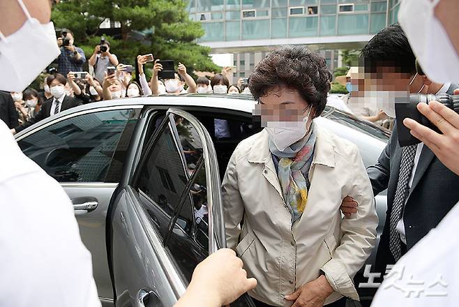 불법 요양병원을 운영하면서 수십억 원대 요양급여를 부정수급 한 혐의로 기소된 윤석열 전 검찰총장의 장모 최 모씨가 2일 오전 경기도 의정부지법에서 열린 1심 선고공판에 출석하고 있다. 의정부지법 형사합의13부(정성균 부장판사)는 의료법 위반과 특정경제범죄 가중처벌 등에 관한 법률 위반(사기) 혐의로 기소된 최씨에 대해 징역 3년을 선고하고 법정 구속했다. 이한형 기자