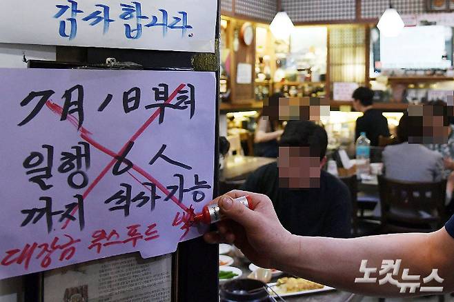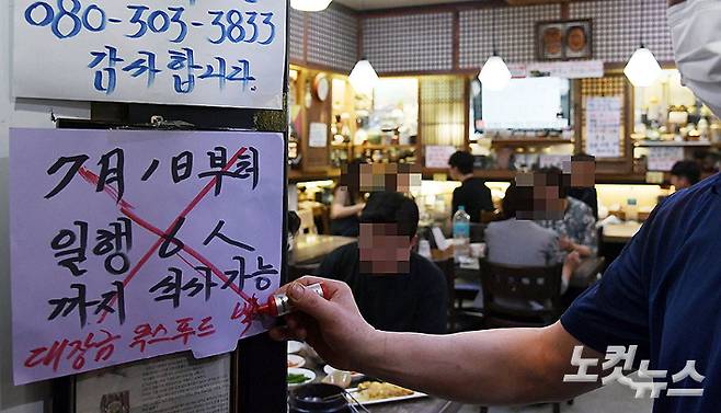 1일 서울 종로구의 한 음식점에 '5인이상 식사 불가함' 안내문이 붙어 있다. 최근 수도권 위주로 코로나19 신규 환자가 급증하고 있는 가운데 홍대 음식점 집단감염을 통한 델타 변이 바이러스 확산 우려가 더해져 정부는 7월1일부터 예정됐던 새 사회적 거리두기 개편안 시행을 수도권에서만 1주일 유예하기로 했다. 이한형 기자