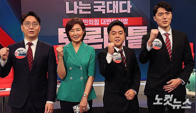 30일 서울 중구 TV조선 스튜디오에서 열린 국민의힘 대변인 선발을 위한 토론 배틀 '나는 국대다(국민의힘 대변인이다)' 4강에 오른 신인규(왼쪽부터), 김연주, 임승호, 양준우 후보가 기념촬영을 하고 있다. 국회사진취재단