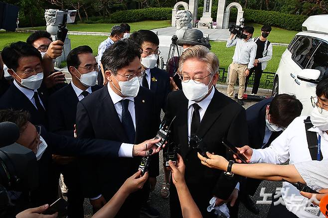 대선 출마를 선언한 이재명 경기도지사가 1일 오전 서울 동작구 국립현충원을 찾아 학도의용군 무명용사탑 참배를 마친 뒤 취재진의 질문을 받고 있다. 국회사진취재단