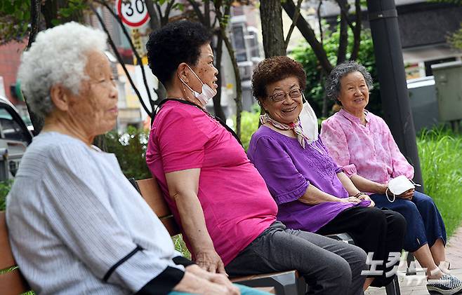 코로나19 백신 접종자의 실외 마스크 착용 의무가 완화된 1일 오후 서울 남부법마을 경로당에서 백신 접종을 완료한 어르신이 마스크를 벗고 담소를 나누고 있다. 황진환 기자