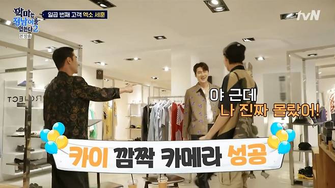 그러나 카이는 전혀 눈치채지 못했다. 카이는 세훈이 나타나자 "나 진짜 몰랐다"고 놀라워했고 나영석 PD는 "이 정도면 같이 그룹 한 이유 없다"고 카이를 놀렸다.