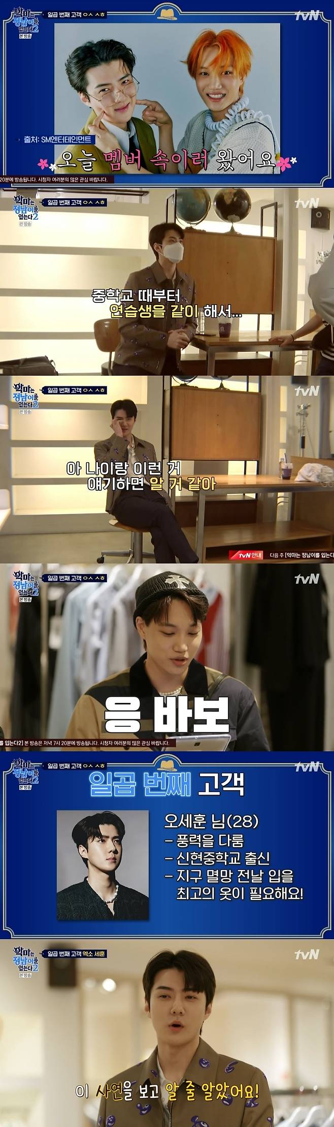 세훈은 일곱 번째 고객으로 등장했다. 카이는 배정남과 세훈이 적은 거짓 사연을 읽었다. 카이는 "풍력발전소에서 바람을 전력으로 바꾸는 일을 하고 있는 신현중이다. 중학교 이름 같다"고 말했고 세훈은 모니터를 보며 "신현중을 믿냐. 이 정도면 다 알려줬는데"라고 어이없어했다.