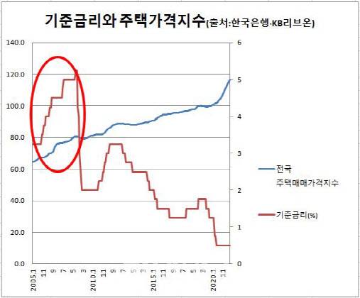 실제 국토연구원에 따르면 금리가 1%포인트 상승할 경우 수도권 주택가격은 연간 약 0.7%포인트 하락하는 효과가 있는 것으로 나타났다.