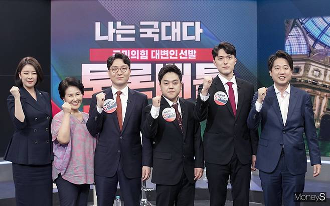 5일 오후 서울 중구 TV조선 스튜디오에서 열린 국민의힘 대변인 선발을 위한 토론배틀 '나는 국대다(국민의힘 대변인이다)' 결승전에서 이준석 대표와 참석자들이 기념촬영을 하고 있다. 이날 결승전에서 임승호 씨가 총 점수 1058점으로 1위, 양준우 씨가 1057점으로 2위를 차지하며 국민의힘 대변인으로 활동하게 됐다. 각각 3, 4위를 차지한 김연주, 신인규 씨는 상근 부대변인으로 활동하게 된다. 왼쪽부터 배현진 최고위원, 전여옥 전 의원, 신인규, 임승호, 양준우 대변인, 이준석 대표.