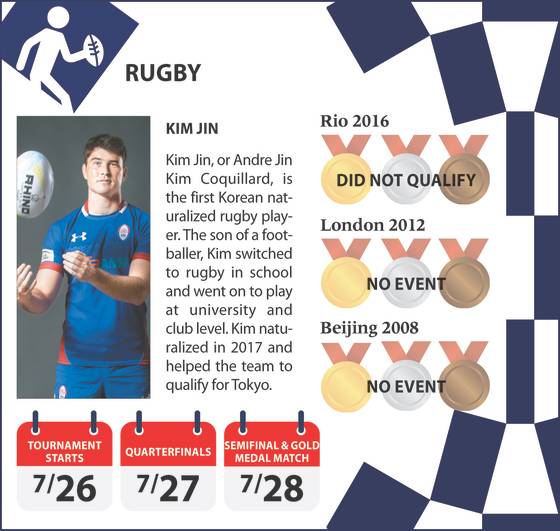 One of the Korea players hoping to make a name for himself in Tokyo is naturalized athlete Kim Jin, or Andre Jin Kim Coquillard. Kim was born in 1991 to an American father and a Korean mother. Any physical advantage is crucial in rugby, and Kim certainly has an edge as he stands at 1.95 meters (6 feet, 5 inches) — not surprising considering his father is 1.83 meters tall and his mother is 1.75 meters tall.