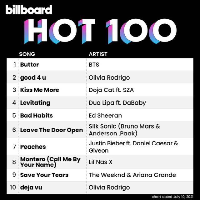 이로써 방탄소년단은 통산 11번째 '핫 100' 정상에 이름을 올렸다. 'Butter' 6회를 비롯해 'Dynamite'(3회), 피처링에 참여한 'Savage Love' 리믹스 버전(1회), 앨범 'BE'의 타이틀곡 'Life Goes On'(1회) 등 4개의 곡으로 일군 눈부신 역사다.