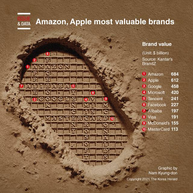 Amazon, founded in 1994 by Jeff Bezos, remained the world’s most valuable brand with an estimated value of $684 billion, followed by Apple, founded in 1976, at $612 billion and Google at $458 billion, Kantar said.