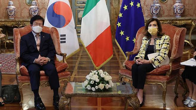 이탈리아를 공식 방문하고 있는 박병석 국회의장이 마리아 카셀라티 상원의장과 로베르토 피코 하원의장과 연쇄 회담을 하고, 입국 시 자가격리를 면제해주는 이탈리아의 '그린패스' 적용국에 우리나라를 포함해달라고 요청했습니다.