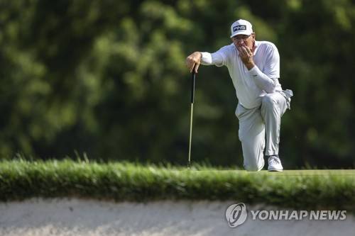 Peter Fowler plots his strategy on the third green during the second round of the U.S. Senior Open Championship at Omaha Country Club on Friday, July 9, 2021, Omaha, Neb. (Chris Machian/Omaha World-Herald via AP) MANDATORY CREDIT; OUT: KMTV; WOWT; KETV; KXVO; KYNE; KPTM