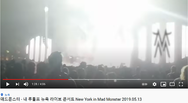 현재 조회수가 88만 회에 육박하는 이 영상에 따르면 공연 날짜는 2019년 5월 13일. 무대는 희뿌연 조명 속에 멀찍이서 잡혀 매드몬스터의 모습은 잘 보이지 않지만, 뉴요커들은 매드몬스터의 노래에 맞춰 환호하며 리듬을 탄다. 코로나 이전, 좋아하는 아이돌의 해외공연을 보러 뉴욕행 비행기를 탈 수 있었던 그 아름다운 시절을 추억하는 댓글들이 이어진다. (실제로는 다른 밴드의 공연 영상에 CG를 입힌 것이다. 매드몬스터는 당시에는 존재하지 않았다.)