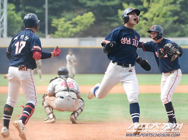 제76회 청룡기 전국고교야구선수권 대회 32강전 성남고와 선린인터넷고의 경기가 10일 목동구장에서 열렸다. 9회초 2사 만루 이유찬의 적시타 때 김민혁이 홈인하고 있다. 목동=정재근 기자 cjg@sportschosun.com/2021.7.10/