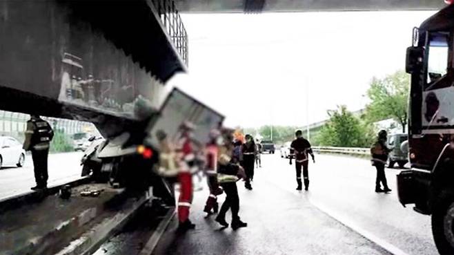 종잇장처럼 구겨진 화물 차량 1대가 청담대교 아래 교각 구조물에 끼어 있습니다.