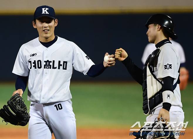 제76회 청룡기 전국고교야구선수권 대회 경남고와 제주고의 경기가 10일 서울 목동야구장에서 열렸다. 경남고 투수 정우중이 팀의 12대4 승리를 확정직소 포수 김민수와 하이파이브 하고 있다. 목동=최문영 기자 deer@sportschosun.com /2021.07.10/