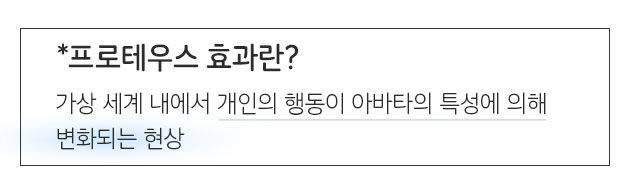 가령 이제 ‘프로테우스 효과’라고 하는데, 저희가 아바타를 선택을 했을 때, 그 아바타에 관련된 컨셉과 내가 나 자신에 대해서 이해하고 있는 자아에 대한 개념이 좀 겹치게 되는 것 같아요. 특히 아바타와 좀 오래 이 활동을 했을 때, 혹은 내가 이 아바타를 가지고 다른 사람들과 상호 작용을 했을 때, 그 아바타로서의 나와 현실의 나의 개념이 서로 합쳐지게 되는 순간이 와요. 그래서 내가 가상 현실을 떠나고 현실 세계로 다시 진입을 하더라도 그 아바타로서의 나에 대한 개념이 같이 따라오게 됩니다.