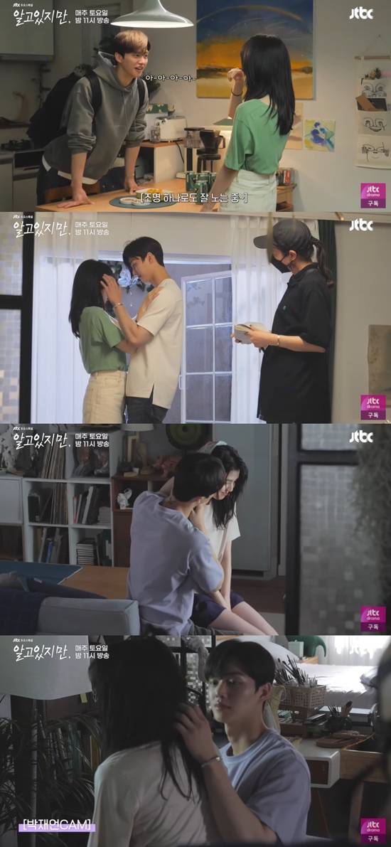 공개된 영상에는 JTBC 토요드라마 '알고있지만'에서 각각 유나비와 박재언 역으로 활약 중인 한소희 송강의 촬영 전 리허설 모습이 담겼다.