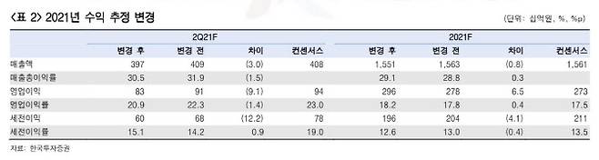 2분기 매출총이익률은 전년 동기 대비 2.6%포인트 하락할 것으로 봤다. 강경태 한국투자증권 연구원은 보고서를 통해 “온실가스 배출권 매각과 같은 일회성 이벤트가 발생하지 않았기 때문”이라며 “온실가스 배출권 매각 대금은 매출원가에서 차금하는 방식으로 손익계산서에 반영하는데 전년 동기와 같음 매각 사례 부재가 매출총이익률 하락으로 이어진 모습”이라고 전했다.