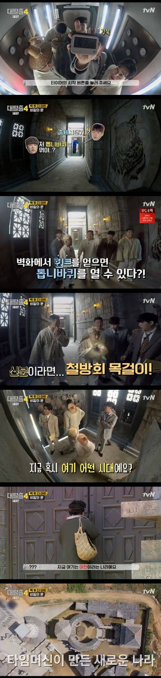 이날 멤버들은 안대를 벗고 주어진 6시간 14분의 시계를 들고 위기에 처한 김태임 박사를 구하러 시간여행을 떠났다. 과거에 도착한 멤버들은 한쪽 벽면에 그려진 호랑이 벽화와 톱니를 보며 "이게 힌트가 봐"라며 차근차근 단서를 찾기 시작했다.