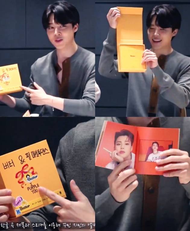 지민은 뛰어난 창의력과 남다른 미술적 재능이 드러난 앨범 꾸미기 중 팬들에게 애교를 부렸다. 지민은 "사랑한다구요" 라며 "저 같은 경우는 새로운 아이디어를 냈는데 한글로 한번 적어봤다. 심플한 걸 좋아해서 아미에게 전한 메시지 간단히 적어봤는데 이걸 쓸 거라곤 예상 못하셨을거다"고 말했다. 그는 '버터 & 펄 미션투댄스' 라고 쓴 한글 글씨와 리본 스티커, ‘Purple you’로 꾸민 심플하고 아기자기한 앨범을 공개해 다재다능한 면모를 보여줬다.
