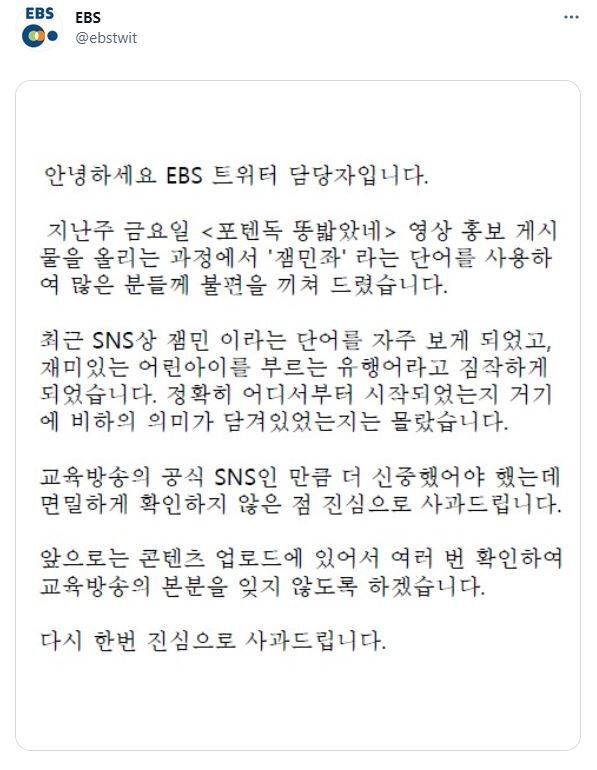 앞서 EBS는 지난 9일 자사 애니메이션 '포텐독'의 삽입곡인 '똥밟았네'를 트위터에 홍보하는 과정에서 '잼민좌'라는 해시태그를 사용했다 단어 사용 적합성 논란에 휩싸였습니다.