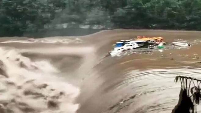 흙탕물로 변한 강에 선박들이 힘없이 떠내려갑니다.