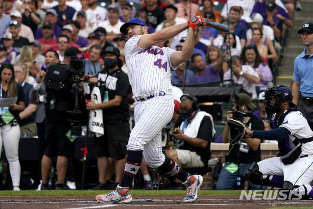 [덴버=AP/뉴시스] 미프로야구(MLB) 내셔널리그 뉴욕 메츠의 피트 알론소가 12일(현지시간) 미 콜로라도주 덴버의 쿠어스필드에서 열린 2021 MLB 올스타전 홈런더비 1회전에서 타격하고 있다. 디펜딩 챔피언 알론소는 4분 동안 35개의 홈런을 기록했다. 2021.07.13.