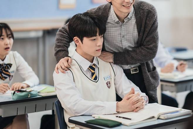 이날 공개된 스틸에는 총명한 눈빛을 빛내고 있는 나우수의 훈훈한 모습이 포착됐다. 학교 최고의 모범생다운 단정하고 말끔한 차림은 물론, 부드럽고 따뜻한 미소까지 장착해 송영고 여학생들의 마음은 물론 시청자들의 마음까지 무장해제할 ‘우수한’ 비주얼이 눈에 띈다. 특히 담임 선생님의 사랑과 독려를 듬뿍 받으면서도 이 상황이 익숙한 듯 무덤덤한 표정을 짓고 있는 그의 일상이 가히 인상적이다.