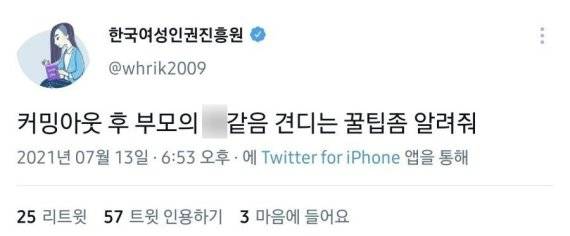 지난 13일 한국여성인권진흥원 트위터 계정에는 "커밍아웃 후 부모의 X같음 견디는 꿀팁 좀 알려줘"라는 내용의 글이 게시됐다.