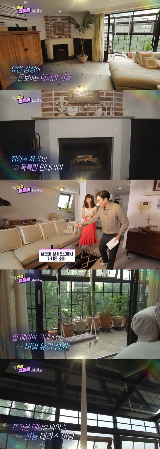 이어 공개된 송경아의 집은 유럽 감성이 돋보이는 화려한 인테리어를 자랑했다. 거실 한 편에 위치한 벽난로에 대해 송경아는 "인부 분들한테 의뢰해 제작했다. 이전 집은 제가 직접 했었다"고 말했다. 또한 인테리어 소품 하나하나를 직접 골랐다는 송경아는 "새로 이 집에 맞춰서 산 줄 아시는 분이 많은데 대부분 10년 정도 세월을 저와 함께했다"고 밝혔다. 이와 함께 송경아는 "남편은 소파만 해왔다"고 싱가포르 산 소파를 자랑하며 너스레를 떨었다.
