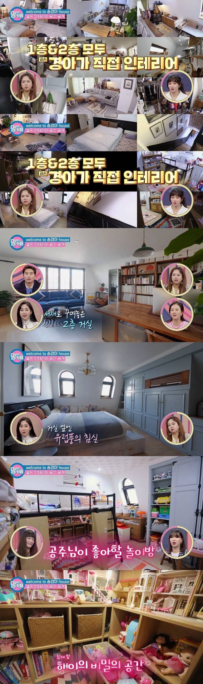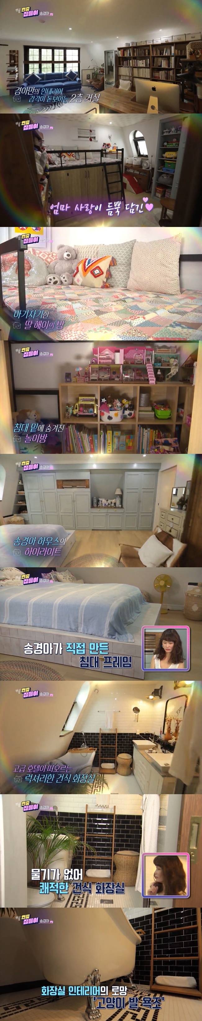 2층으로 올라가자 인테리어 감각이 돋보이는 거실이 등장했다. 이 가운데 송경아는 2층 계단 난간에 붙은 벽돌 인테리어에 대해 "제가 직접 미장을 했다"고 밝혀 이휘재를 놀라게 했다. 2층엔 거실과 함께 송경아 부부의 방과 딸 해이 방이 위치해 있었다. 해이 방은 딸이 직접 고른 벙커침대가 자리했고, 아래 비밀 공간을 열자 동화 속 한 장면 같이 정리된 장난감들이 반겨줬다.