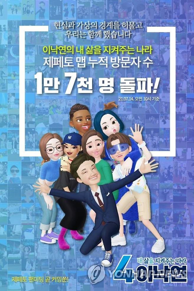 더불어민주당 이낙연 대선 예비후보 측은 지난달 22일 개설한 메타버스(가상세계) 플랫폼 '내 삶을 지켜주는 나라' 제페토 맵 누적 방문자수가 1만7천명, 팔로워 수 1천700명(14일 오전 10시 기준)을 넘어섰다고 14일 밝혔다.