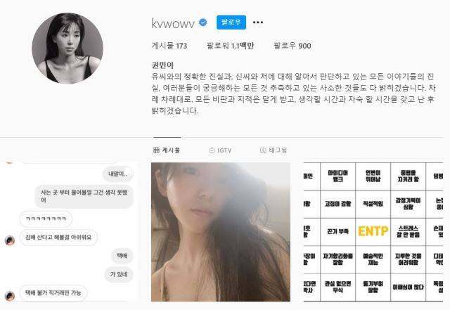 권민아는 최근 자신의 인스타그램 프로필에 "유씨(전 남자친구)와의 정확한 진실, 신씨(신지민)와 저에 대해 알아서 판단하고 있는 모든 이야기의 진실, 여러분들이 궁금해하는 모든 것 추측하고 있는 사소한 것들도 다 밝히겠다"라는 글을 올렸다.