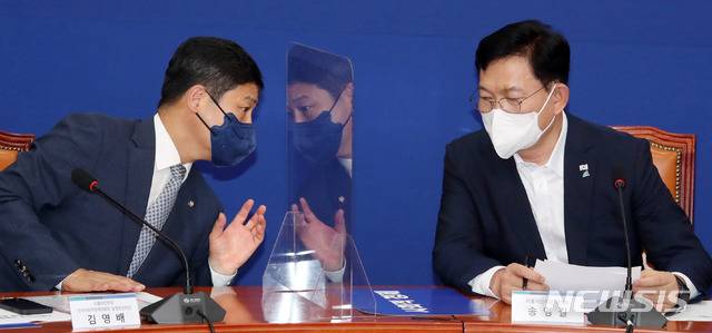 [서울=뉴시스] 최동준 기자 = 더불어민주당 송영길 대표, 김영배 단장이 14일 서울 여의도 국회에서 열린 사회적경제 입법추진단 당정청회의에서 대화하고 있다. (공동취재사진) 2021.07.14. photo@newsis.com