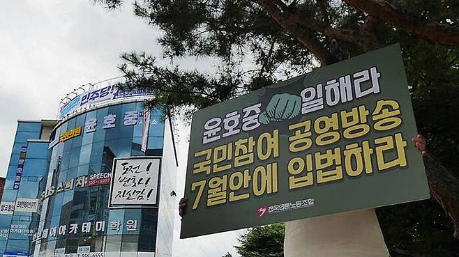 전국언론노동조합이 국민 참여 공영방송법 처리를 요구하며 경기도 구리시에 위치한 더불어민주당 윤호중 원내대표의 지역구 사무실에서 항의 농성에 돌입했습니다.