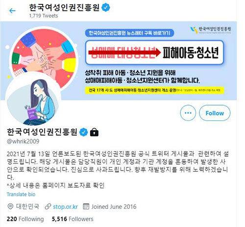 여성인권진흥원은 오늘 오전 설명자료와 트위터를 통해 "해당 게시물은 담당 직원이 개인 계정과 기관 계정을 혼동하여 발생한 사안으로 확인됐다"고 해명했습니다.