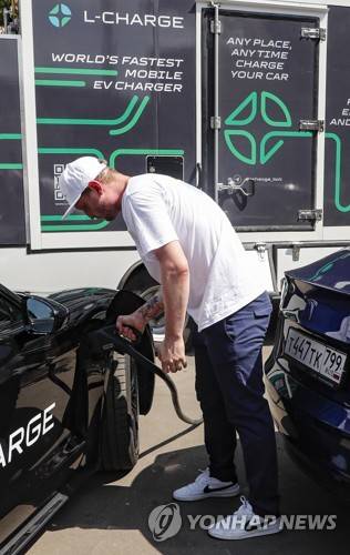 epa09343665 A man charges his electric car from Tesla at the L-Charge ultra-fast mobile multi-fuel charger for electric vehicles in Moscow, Russia, 14 July 2021. L-Charge is an off-grid (standalone) solution from the Russian developer 'L-Charge'. The company expects to create a rapidly deployable network for the development of more ecological transport in Russia. The company is expected to deploy 20,000 ultra-fast mobile chargers by the end of 2022. Liquefied natural gas is the source of an energy generation on the mobile charger. However, already now it also provides for the option of switching to hydrogen. Charging an electric vehicle on a mobile charger will cost 30 percent less than charging from the mains. EPA/MAXIM SHIPENKOV