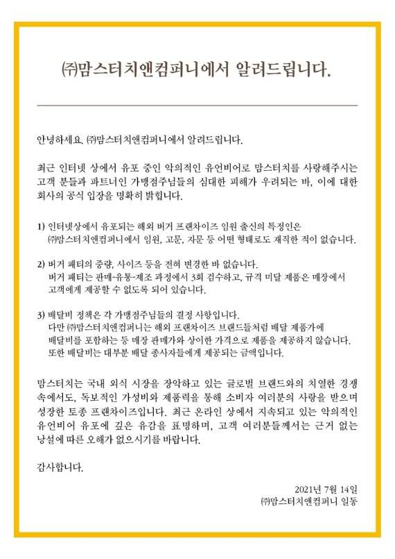 맘스터치앤컴퍼니는 “최근 인터넷 상에서 유포 중인 악의적인 유언비어로 맘스터치를 사랑해주시는 고객 분들과 파트너인 가맹점주님들의 심대한 피해가 우려되는 바 이에 대한 회사의 공식 입장을 명확히 밝힌다”고 전했다.