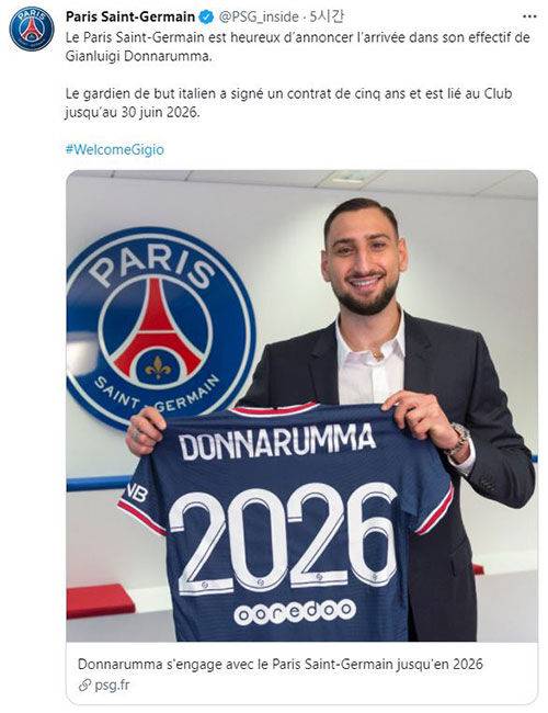 PSG는 "돈나룸마와 2026년 6월 30일까지 5년 계약을 했다"고 발표했습니다.